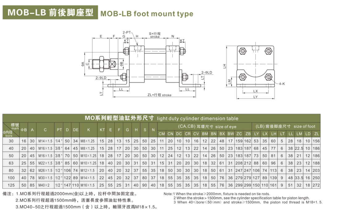 MOB轻型拉杆式液压油缸规格型号结构图、尺寸图及装配图 MOB轻型拉杆式液压油缸的油缸筒采用无缝钢管,根据油缸工作压力不同,可选用不同壁厚的钢管, 其内径加工精度高、结构紧凑、重量轻、安装连接方式多样,且有低速性能好和缓冲性能稳定的优点,压 力范围在 0-7Mpa,汉力达 MOB轻型拉杆式油缸广泛作为机床液压缸、轻纺机械油缸、塑料机械油缸和农 机用油缸。 一、 MOB 油缸内径和工作压力 压力和缸径对照表 缸径